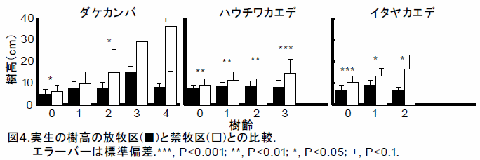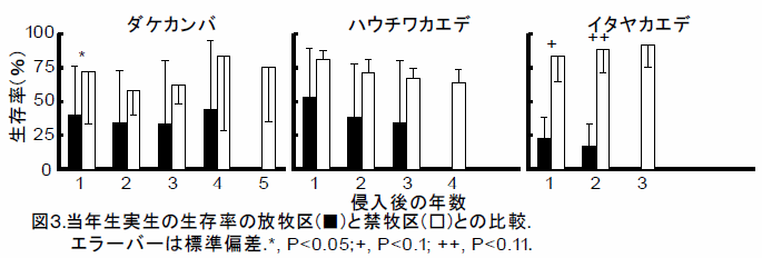- 放牧は、採食や踏圧によりダケカンバ、ハウチワカエデおよびイタヤカエデの当年生実生の翌年以降の生存率を低くし(図3)、さらに樹高伸張を抑制すること(図4)によって樹木の個体数の増加および伸張を防ぐ。