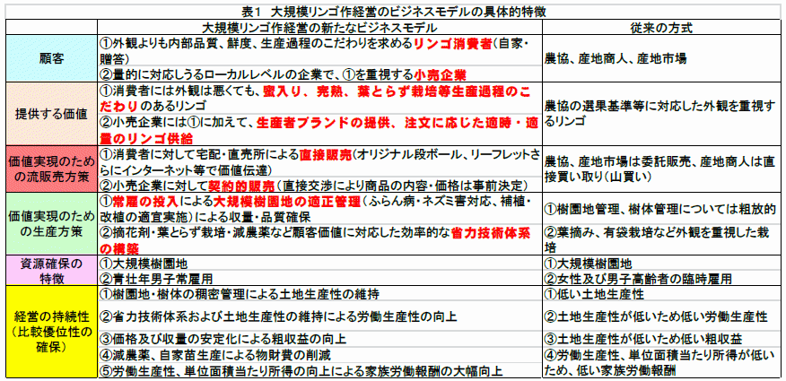 - ビジネスモデルの具体的特徴は表1の通りである。常雇を導入してふらん病・ネズミ害対応、補植・改植の適宜実施など樹園地管理を適正に行うとともに、摘花剤・葉とらず栽培、減農薬栽培などにより省力技術体系を構築する。かかる省力技術体系は、一般的商品判断基準である外観品質を低下させることから、卸売市場のセリ取引では価格が著しく低くなる。そのため、顧客に提供する価値を「蜜入り、完熟、大玉(32玉標準)、葉とらず栽培など生産過程のこだわり」とし、その価値を理解する消費者、そうした消費者を重視する小売企業を顧客として確保する。小売企業には、「生産者ブランドの提供及び注文に応じた適時・適量の商品供給」という価値も提供する。