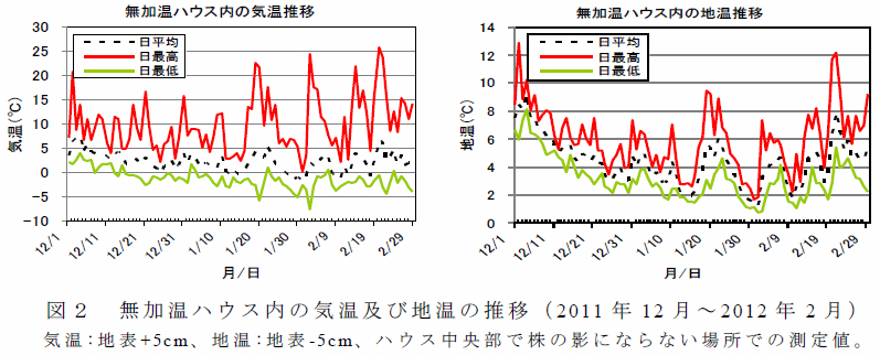 - ハウス内の最低気温は12〜2月には0〜-8度Cとなる(図2)が、凍害は認められない。
