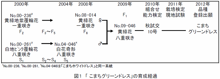 - 「こまちグリーンドレス」は、No.08-014(黄緑花一重咲き)を種子親、No.04-046(白花奇形八重咲き) を花粉親とするF1 品種である。種子親の固定は雑種第2 世代のNo.00-236(黄緑地紫覆輪花一重咲き)を母本として2000 年から開始し、雑種第6世代のNo.08-014 で固定を終了した。花粉親の固定はNo.00-261 を父本として2000 年から開始し、自殖第5世代のNo.04-046 で固定を終了した(図1)。