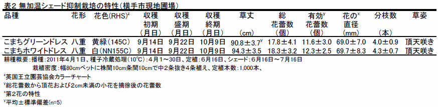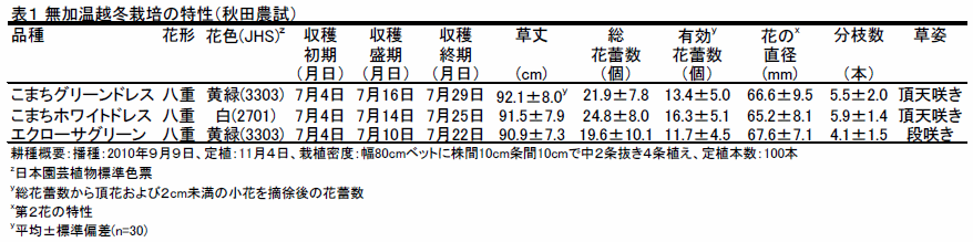 - 開花の早晩は中晩生で、11 月定植の無加温越冬栽培における収穫期は7月で、6月定植のシェード抑制栽培における収穫期は9〜 10 月である。草丈は90cm 以上で有効花蕾数は10 個以上着生する(表1、2)。