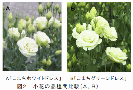 - 本品種は、2009 年に育成した「こまちホワイトドレス」と同一の母本および父本から育成したため、花色以外は類似した生育特性、切り花形質を示す(表1、2、図1、2)。