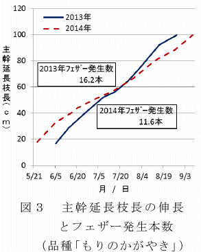 - 苗木の生育が劣る場合は、十分なフェザーが確保できないことがあるので(図2)、使用する1年生苗木は、生育良好なものを選択する。特に7月は生育が停滞しやすいので(図3)、乾燥時のかん水の徹底や定期的な除草を行うことが重要である。なお、ポットに使用する土はリンゴ園以外の肥沃な土壌を使用することが望ましく、たい肥や土壌改良資材を混合する。
