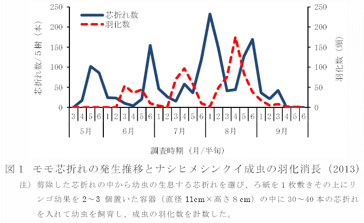 - ナシヒメシンクイ幼虫の年間の発生回数および発生時期(始期と盛期)は、モモ芯折れの発生推移に連動している(図1)。