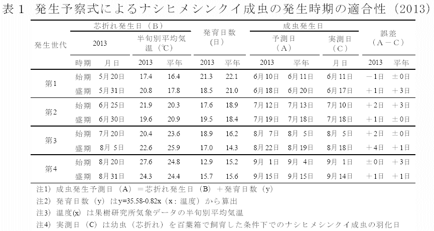 - ナシヒメシンクイの成虫発生盛期における予測日と実測日の誤差は、第1世代では当年値(2013年)を使用した場合は+1日、平年値を使用した場合は+3日、以下同様に第2世代では+1日、±0日、第3世代では+4日、+1日、第4世代では+1日、+1日であり、誤差の範囲は4日以内である(表1)。