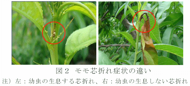 - 調査対象とするモモ芯折れは、幼虫の生息する芯折れ症状(食害部から虫糞を排出、図2)とし、幼虫の生息しない芯折れ症状(食害部が黒褐色に変色し食害後7日以上経過、図2)と区別する。