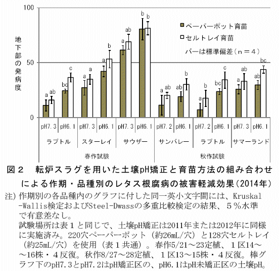 - 一般的な育苗方法のうち、セルトレイ育苗よりもペーパーポット育苗を行うと定植時に根が傷みにくく、レタス根腐病の被害を軽減することができる(図2)。さらに、転炉スラグによる土壌pH矯正を組み合わせると効果的である(図2)。