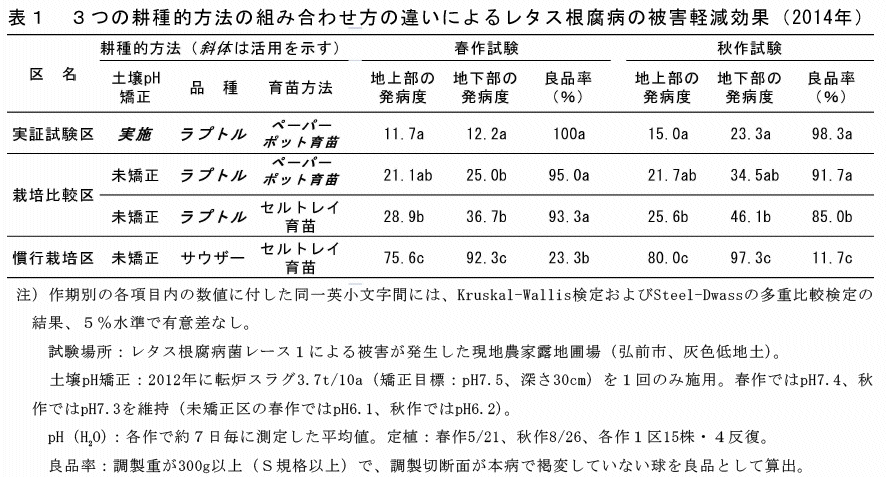 土壌pH矯正、品種、ペーパーポット育苗を組み合わせたレタス根腐病の被害軽減