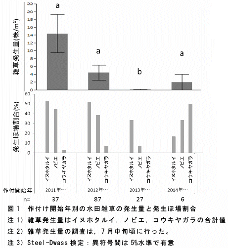 - 早期に水稲の作付けが開始された地域では,イヌホタルイやノビエの発生量が多い。イヌホタルイ・ノビエは作付け開始年に関わらず発生している一方で,より沿岸部に近い復旧後間もない水稲作付けほ場では特異的にコウキヤガラの発生が多い(図1)。