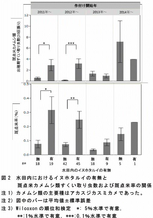 - アカスジカスミカメが寄主とするイヌホタルイ,ノビエ,コウキヤガラの有無と,斑点米の関係をみると,早期に水稲の作付けが再開された地域では,水田内にイヌホタルイが存在するほ場で斑点米の発生リスクは高まる。それに対して復旧後間もない水稲作付けほ場では,雑草が管理されているほ場内であってもカメムシ類が多く確認されており,水田内雑草発生の有無だけでは斑点米発生リスクを説明できない(図2)。