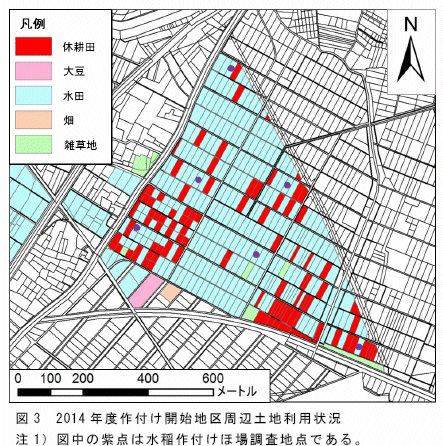 - 本研究は2011年から復旧を進めている宮城県N市での3ヶ年分の調査データを基としている。作付けが再開された地点を順次調査地点に組み込んでいるため,作付け開始年の異なる地域間では,調査年数は異なる。