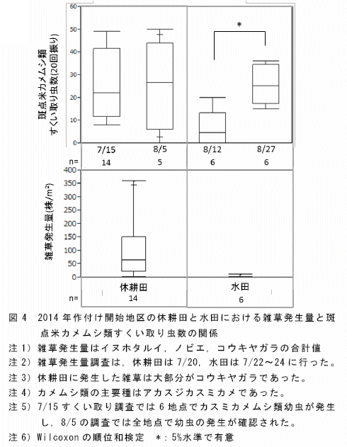 - 復旧後間もないほ場の周辺には,未だ作付けされない休耕田が点在しており(図3),休耕田内にはコウキヤガラを中心とした雑草が繁茂している。それらの休耕田は斑点米カメムシ類の繁殖地となっており,そこから水稲が作付されているほ場への飛び込みが生じている(図4)。