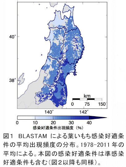 - 1978年から2011年、6月下旬から8月上旬の51日間を対象として、東北地方6県のアメダス観測値(降水量、風速、日照時間、気温)を統計的手法(空間内挿)によって1kmメッシュ化し、BLASTAMによる葉いもちの予察をメッシュ毎に行なった。国土数値情報土地利用3次メッシュデータ(1976年版)を参照し、東北全域のうち水田、畑地のいずれかを含むメッシュを計算対象とした。得られた感染好適条件(準感染好適条件を含む)の各メッシュの解析期間中の平均出現頻度(感染好適条件の出現日数/解析期間日数、図1)は、全体的に太平洋側南部で高く、日本海沿岸の平野部で低い傾向にある。いもち病は寡照・多湿の条件下で発生しやすいため、ヤマセの影響が大きい太平洋側や、梅雨前線に近い南部で感染好適条件の出現頻度が高くなる。