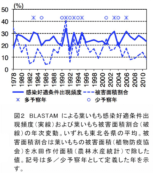 - BLASTAMで推定した感染好適条件の全対象メッシュの平均出現頻度と、実際の葉いもちの発生面積割合との年次変動を比較した(図2)。BLASTAMでの発生予察は、年次ごとの葉いもち発生傾向を捉えている。県別では、感染好適条件の出現頻度が高い宮城県(r=0.56、1%有意)と福島県(r=0.51、同)で、両者の変動が一致した。
