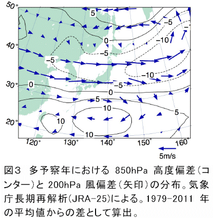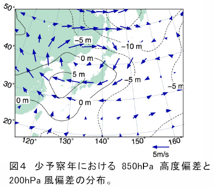 - 感染好適条件の出現頻度が高かった順に6年を多予察年、低かった順に6年を少予察年と定義し、これらの年の合成図によって大規模気象場の特徴を調べた。図3、4に両者の200hPa風系と850hPa高度の解析期間全体(気象庁長期再解析 JRA-25に含まれない1978年を除く)からの偏差を示す。葉いもち予察頻度の多い年(図3)は、一般的な年に比べ亜熱帯ジェットの位置が南下し東北地方付近にあることや、前線帯の停滞など、湿潤な状態であったことを、少予察年(図4)には高気圧性循環、本州一帯の高圧部など暑夏の特徴がみられ多照・少雨であったことを、それぞれ示唆している。