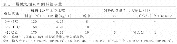 - 黒毛和種妊娠牛(妊娠確認後から分娩1か月前)の冬期屋外飼養は、最低気温に応じエネルギー充足のためのコーンサイレージ(以下CS)や圧ぺんトウモロコシの飼料の増給(表1)を行うことで、分娩後の繁殖成績、産子の雌雄別生時体重、日増体量に影響を与えない(表2)。給与量の変更は、最低気温が低下する時は設定温度以下となった日に行い、気温が上昇する時は設定温度を超えた日が5日間以上続いた日に行う。