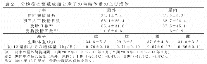 黒毛和種妊娠牛の冬期屋外飼養は、最低気温に応じた増給を行うことで、分娩後の繁殖成績や産子の発育状況に影響を与えない。また、管理時間は屋内飼養と比較して軽減される。