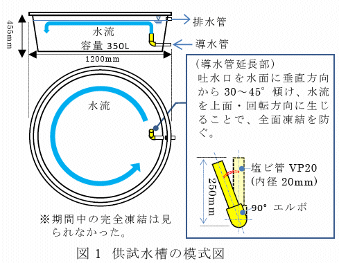 - 沢水利用等で、給水施設の凍結防止対策の実施が不可能な場合には、円形水槽への配管の工夫により、厳冬時でも水槽の全面凍結を防ぐことが可能である(図1)。