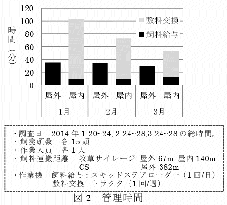 - 冬期屋外飼養は敷料交換作業が不要であり、屋内飼養と比べて管理時間が少ない(図2)。