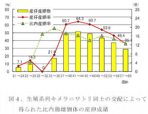 - 生殖系列キメラニワトリから生まれたPGCs由来の比内鶏は正常な繁殖能力を有する(図4)。
