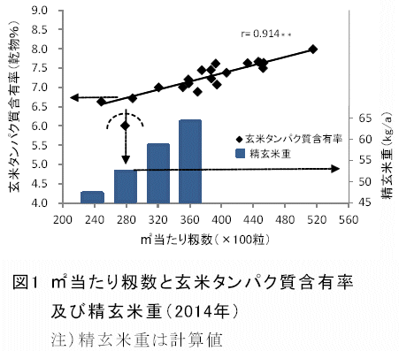 - 玄米タンパク質含有率7.0%(乾物換算)以下で、青森県の収量目標54kg/aとなる平方メートル当たり籾数は28,000粒程度である(図1)。目標となる籾数が少ないため、窒素施肥総量は「つがるロマン」より0.1kg/a程度減じ、その70〜80%を基肥量とする。