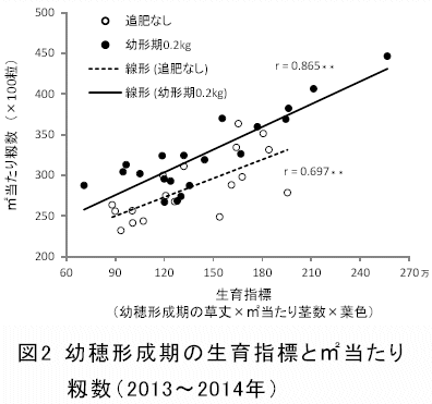 - 幼穂形成期の生育指標(草丈×平方メートル当たり茎数×葉色値)が95万未満であれば、幼穂形成期に0.2kg/aを上限に追肥を行うと、平方メートル当たり籾数が28,000粒程度となる。また、129万以上の場合は、追肥を中止する(図2)。