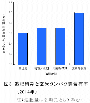 - 追肥時期が幼穂形成期より遅れると、玄米タンパク質含有率が高くなるので、幼穂形成期以降の追肥は行わない(図3)。