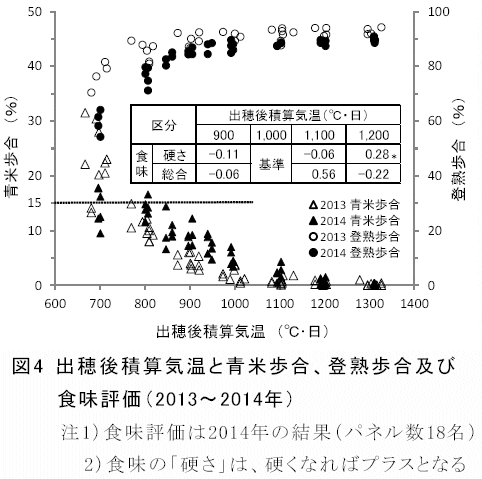 - 刈取始期は、青米歩合15%以下で、登熟歩合の増加が横ばいとなる出穂後積算気温900度Cとする。また、出穂後積算気温1,200度Cになると、炊飯米が硬くなり、食味総合評価を下げる恐れがあるので、刈取終期は出穂後積算気温1,100度Cとする(図4)。