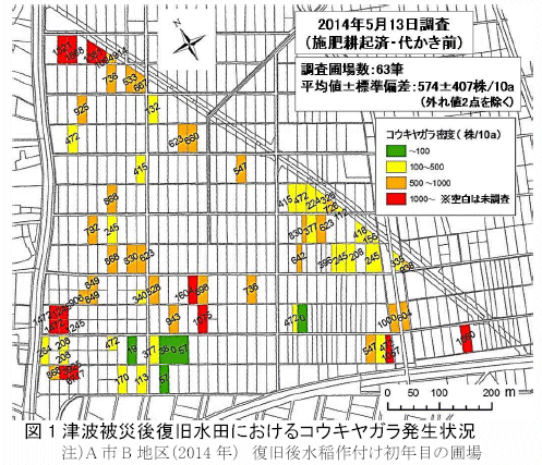東日本大震災大津波の被害を受けた水田では、復旧までの休耕や復旧工事に伴う土壌の移動により、以前から難防除雑草として問題となっていたコウキヤガラの繁茂や分布の拡大が確認され、有効な防除対策が求められている(大川ら2012)。また、復旧農地の大区画化や担い手への農地集積が進み、効率的で省力的な雑草防除の方法も求められている。