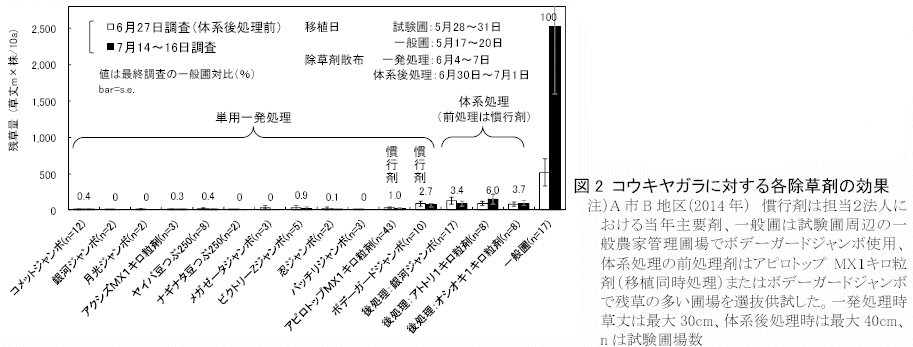 - A・B両試験地域は砂質の強い土壌であるが比較的水もちが良いこと、A市B地区の試験圃場は一般圃と比べ1〜2週間程度移植が遅く、コウキヤガラの発生が揃った後に代かき・移植を行ったこと等も防除効果の向上に寄与したと考えられる。