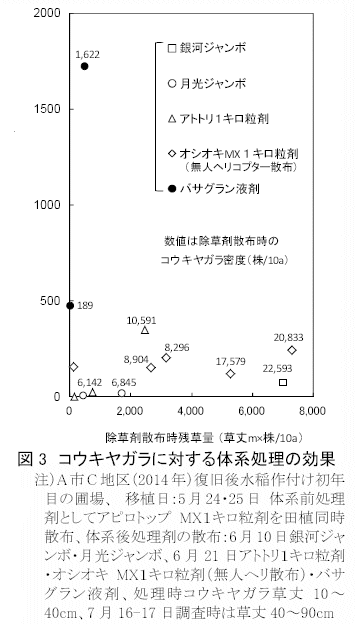 - 同様に復旧後初年目の水稲移植後に,10aあたり数千〜2万株の高密度でコウキヤガラが残草している地域においても、水稲用除草剤4種を体系後処理剤として散布することで、残草株および後発株が抑制され、高い防除効果が得られる(図3)。