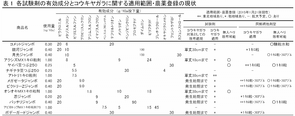 - コウキヤガラに対して効果の高い水稲用除草剤は、有効成分としてピラクロニルとメタゾスルフロン、ピリミスルファン、プロピリスルフロン、アジムスルフロンといったALS(アセト乳酸合成酵素)阻害剤を配合した混合剤であり、少量投げ込み散布に対応したジャンボ剤や豆つぶ剤等の拡散性製剤、無人ヘリコプター散布に対応した剤もあり、散布作業の省力化を図ることも可能である(表1)。