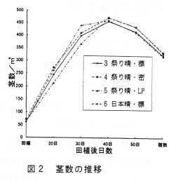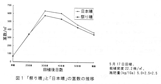 - 「祭り晴」は「日本晴」に比べ分げつの増加が緩慢で、最高分げつ数もやや少ない傾向がある(図1)。