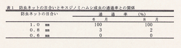 - 防虫ネットの目合いと成虫の通過率との関係は、1.0o目合いではすべての個体が通過するが、0.8o目合いでは2〜3%とほとんどの個体の通過を阻止でき、0.6o目合いでは完全に通過を阻止できる(表1)。また、雨よけハウス下で0.8o目合い以下の防虫ネットでトンネル状に被覆すると、1.0o目合いに比べて顕著に被害が軽減される(図2)。