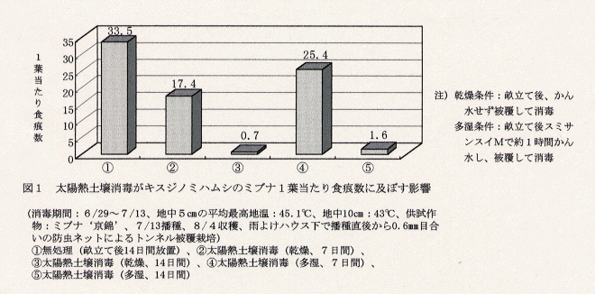 - 畝立て後に太陽熱土壌消毒を14日間行うと、土壌の乾湿に関係なくキスジノミハムシ成虫の食痕数は顕著に減少するが、7日間では効果が低い(図1)。