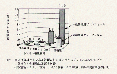 - ミブナ栽培において、近紫外線カットフィルムと0.6o又は0.8o目合いの防虫ネットによるトンネル被覆を併用しても、商品性への影響は認められない。