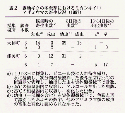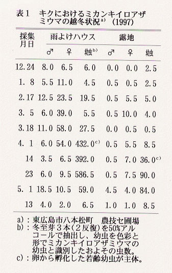- 本種は東広島市八本松町(1997年1〜2月の平均気温:2.3℃、最低気温:2月5半旬 の-4.2℃)の雨よけハウスと露地ギクの冬至芽上で、成虫、幼虫など、種々の発育ステージで越冬している(表1)。