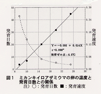 - 卵の発育零点は6.5℃であり、片山(1997)の報告の9.5℃と異なる(図1)。卵の有効積算温度は73日度である。