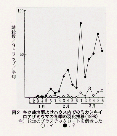 - 冬至芽の生えた雨よけハウス内における本種の羽化は、1月〜2月中旬まではわずかしかみられない。しかし、2月中旬以降、本種の羽化は徐々に増加し、3月になると急増する(図2)。成虫は10℃ではわずかずつ産卵するが、7.5℃では産卵しない。卵から成虫までの発育零点は7.5℃で、有効積算温度は242日度である。