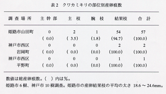 - クワカミキリの産卵痕は大半が 1年生の結果枝に認められ、主枝および腕枝にはほとんど認められない。また、主幹部には全く認められず(表2)、姫路市における産卵結果枝の平均の太さは18.6〜24.6mmである。
