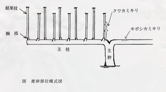 - キボシカミキリの産卵痕は主枝に最も多く、全産卵痕数の74.5〜100%を占め、そのうち、主枝上面に76.3〜98%、主枝下面に2〜23.7%が認められる。そのほか、主幹部に全産卵痕数の0〜10.6%、腕枝には12.5%が認められ、北面より南面に多い(表1)。