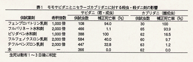 - 合成ピレスロイド剤であるフルバリネート水和剤はサビダニに対してほとんど防除効果がない上に、カブリダニに対して著しい悪影響を及ぼす。一方、同じ合成ピレスロイド剤でもフェンプロパトリン乳剤はカブリダニに対する悪影響は大きいが、サビダニに対する防除効果は高い(表1)。