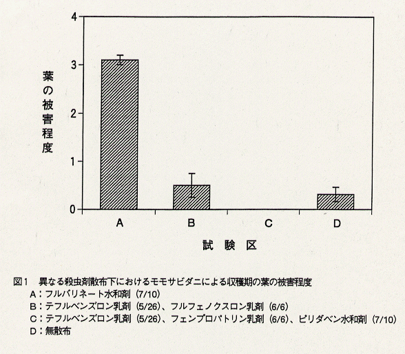 - 収穫期の葉の被害程度は、フルバリネート水和剤を散布した区できわだって大きく、テフルベンズロン乳剤とフルフェノクスロン乳剤を散布した区、フェンプロパトリン水和剤やピリダベン水和剤などを散布した区、無散布区では低い(図1)。なお,テフルベンズロン乳剤とフルフェノクスロン乳剤を散布した区及び無処理区ではカブリダニが多く観察された。