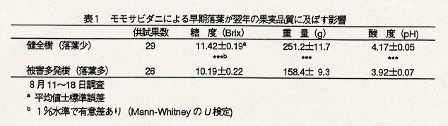 - サビダニの加害によって早期落葉した被害多発樹(9月下旬の落葉率:70〜80%)では、健全樹(同5〜10%)に比べ、翌年の果実の糖度、重量、酸度がいずれも有意に減少する(表1)。これは被害多発樹で樹勢が低下していることを示唆している。