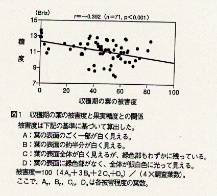 - 収穫期の葉の被害度と果実の重量、酸度との間には一定の関係がみられない。しかし、糖度は被害度が増加するにつれて有意に減少する(図1)。