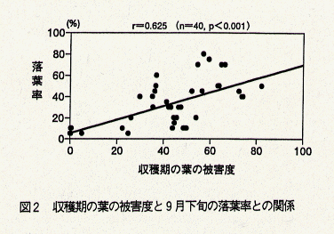 - 収穫期の葉の被害度が増加するにつれて9月下旬の落葉率も有意に増加する(図2)。通常の落葉期は10月下旬であることから、サビダニに強く加害された樹では早期落葉が起こりやすいと考えられる。