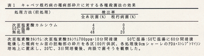 - キャベツ根朽病の罹病部砕片を50℃・60分温湯処理すると、培地上で糸状菌は認められない。次亜塩素酸カルシウム700ppm・10分処理では少し糸状菌の発生が認められる(表1)。
