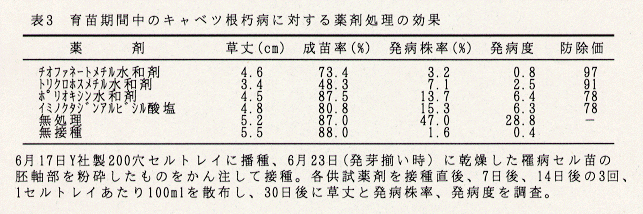 - 以上からキャベツ根朽病発病抑制のためのセルトレイの殺菌方法は温湯消毒が最も効果的で、育苗期間中の防除薬剤としてはチオファネートメチル水和剤の散布が有効である。