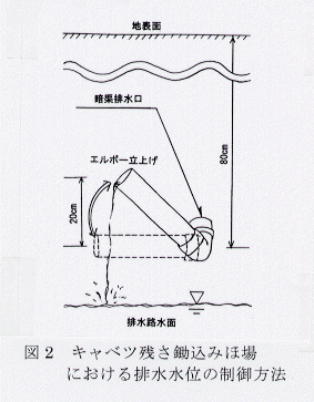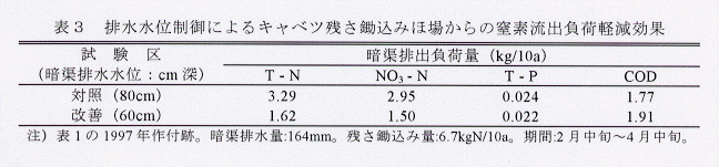 - キャベツの収穫残さを鋤込むと、分解されやすく、後作水稲までの間に窒素の流出量が増加する。しかし、暗渠排水口にエルボーを取り付け、排水水位を高くすると、排水中の硝酸態窒素濃度が明らかに低下し、リンおよび CODの流出量もほとんど増加せず、水田下層土の還元層を利用した水質浄化が可能である(図2、表3)。
