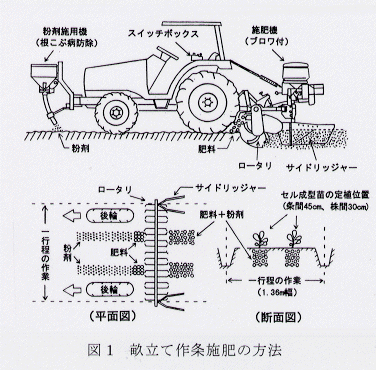 - 畝立て作業時に、ブロワ付き施肥機(容量120L)をロータリに装着し、ロータリの前にすじ状に施肥すると、基肥の作条施用が能率的に精度良くできる(図1)。また、トラクタ前部に粉剤施用機を装着すると、根こぶ病防除粉剤の作条施薬も同時にできる。